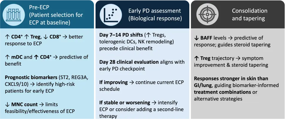 During the consolidation phase of ECP, several biomarkers can help inform decisions around treatment tapering and long-term disease control. In skin-predominant cGvHD, lower BAFF levels (<4 ng/mL at 1 month) have been shown to predict clinical response or complete remission at 3–6 months, supporting corticosteroid tapering, whereas persistently elevated BAFF is associated with poorer outcomes.11 Over extended courses, a rising trajectory of circulating Tregs often parallels symptomatic improvement and steroid reduction, indicating PD evidence of disease control.12 ECP responses are typically more pronounced in skin involvement and less robust in severe gastrointestinal or pulmonary disease, indicating where biomarker-informed treatment combinations or alternative therapeutic strategies may be most beneficial.13