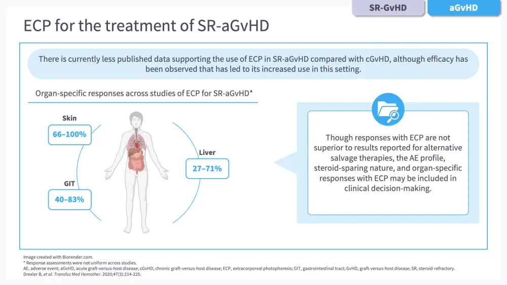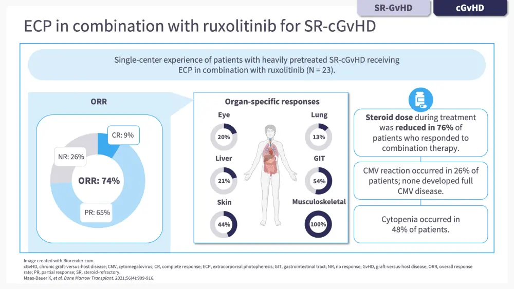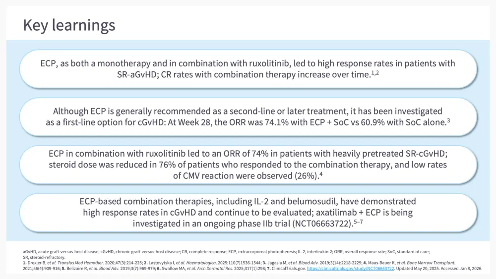 In the second chapter of this e-learning module, we go through some of the clinical findings supporting the use of ECP either alone or in combination with other agents, including ruxolitinib, belumosudil, interleukin-2 (IL-2), and axatilimab, in patients with GvHD.