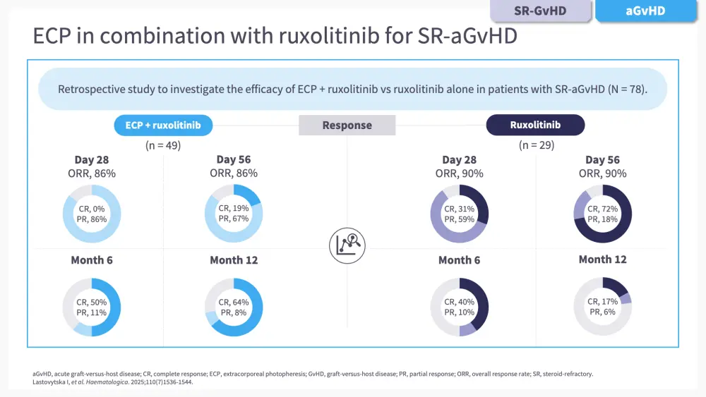 Do you know... In a retrospective study by Lastovytska et al., what was the CR rate at Month 12 in patients with SR-aGvHD treated with ECP + ruxolitinib?