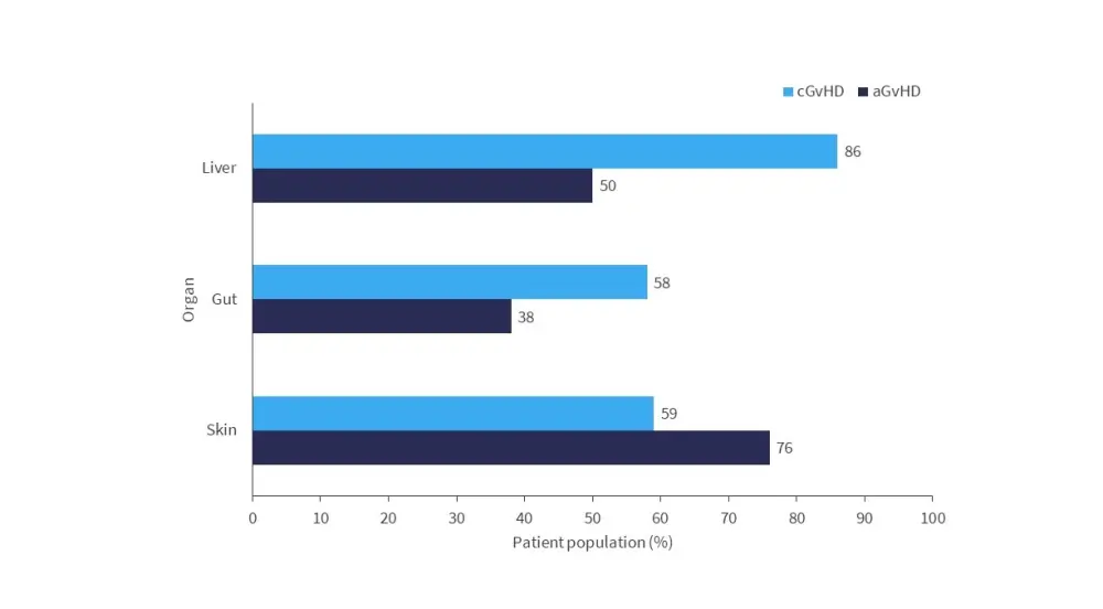 Below, Figure 1 illustrates complete response rates in patients with aGvHD and cGvHD, focusing on skin, gut, and liver involvement.