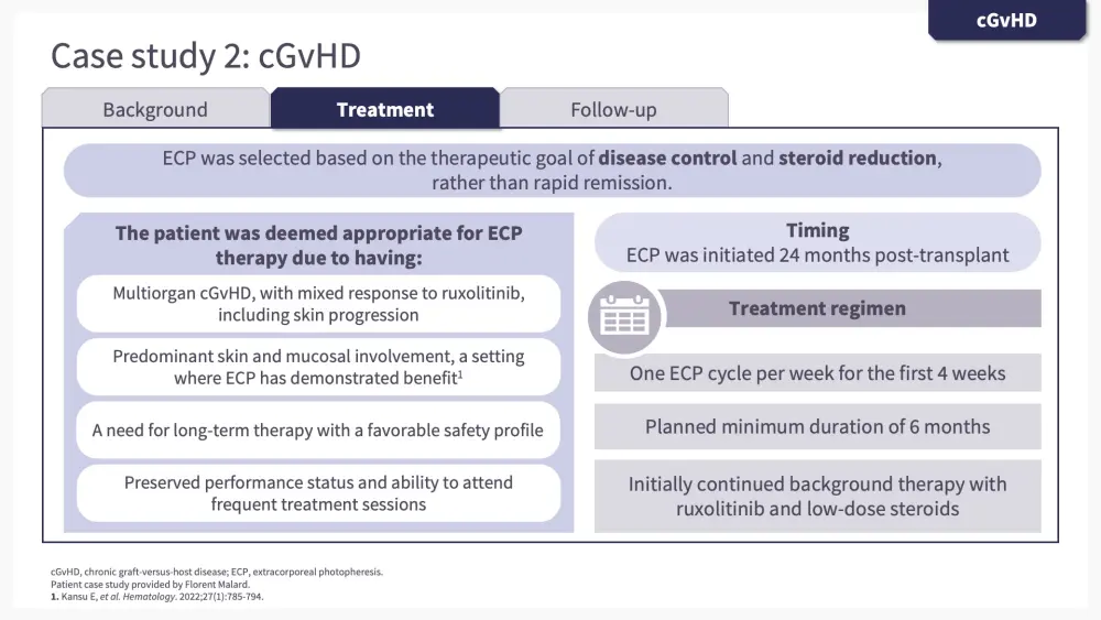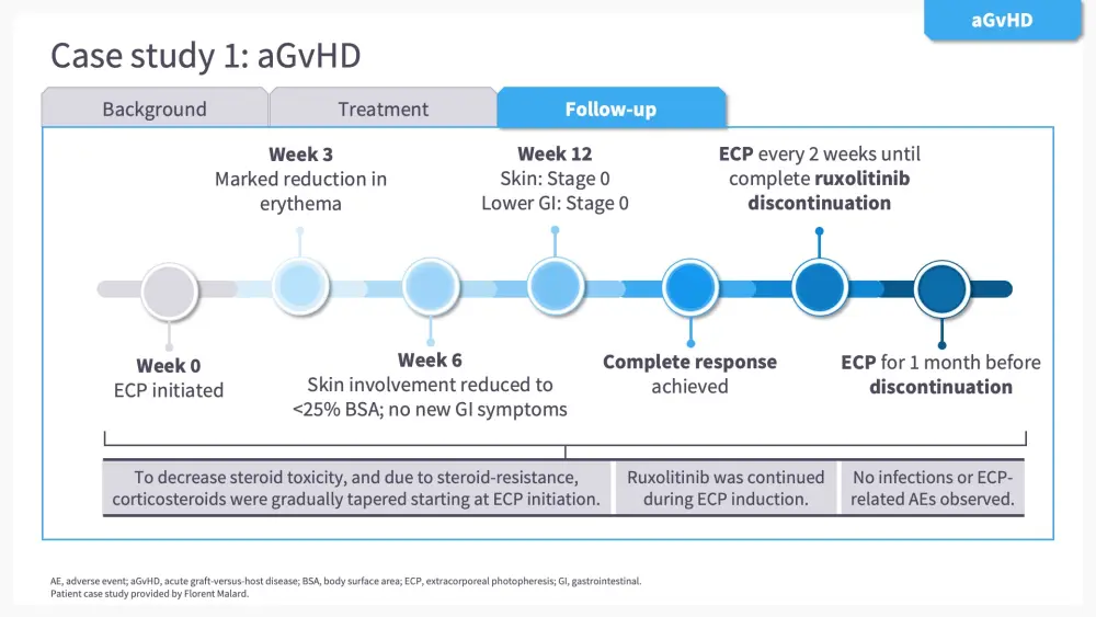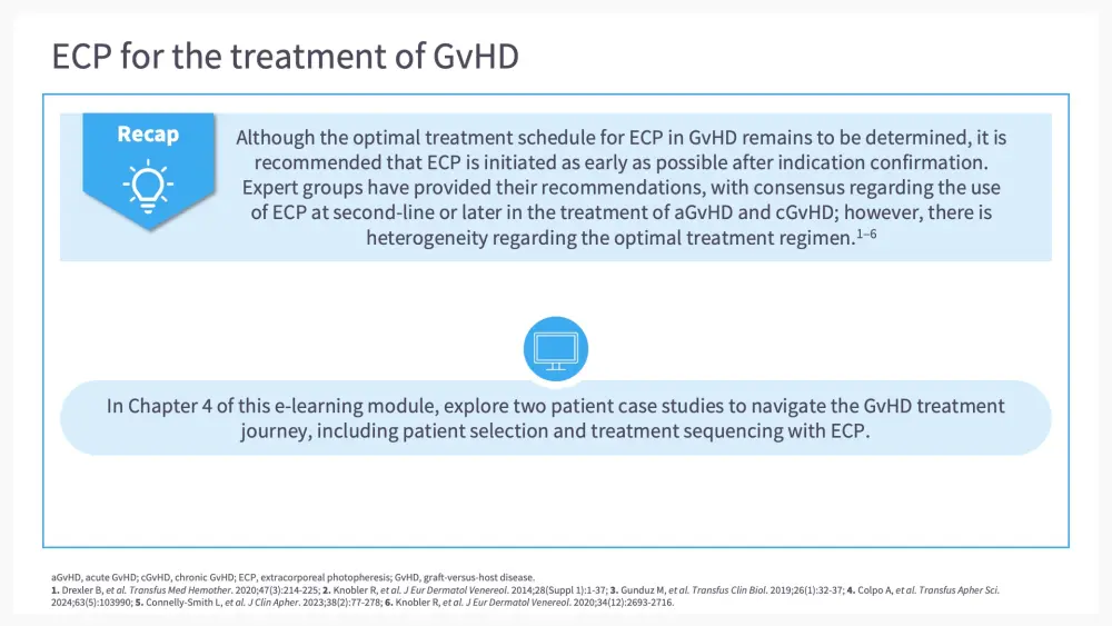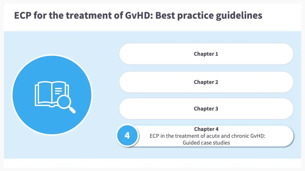 In the final chapter of this e-learning module, explore two patient case studies to navigate the GvHD treatment journey, including patient selection and treatment sequencing with ECP in both acute and chronic GvHD.