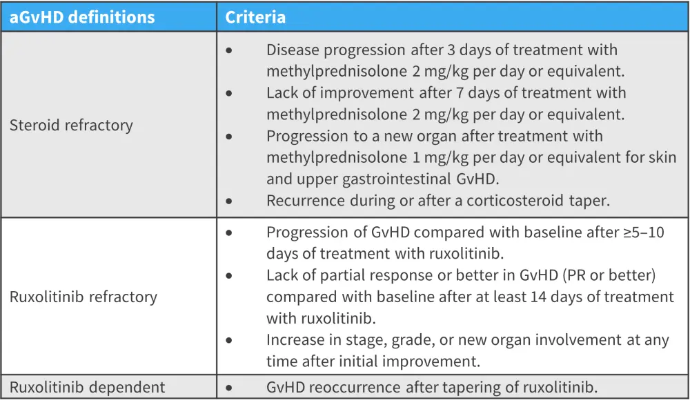 While defining SR-GvHD is difficult, general criteria exist to diagnose it; this is particularly useful for patients entering clinical trials. Also, reaching a consensus on the definition of SR-GvHD may ensure that comparisons across studies of SR-GvHD are more accurate.1 In 2020, Mohty et al.1 proposed definitions for SR-aGvHD and ruxolitinib-refractory aGvHD, these are outlined in Figure 1.