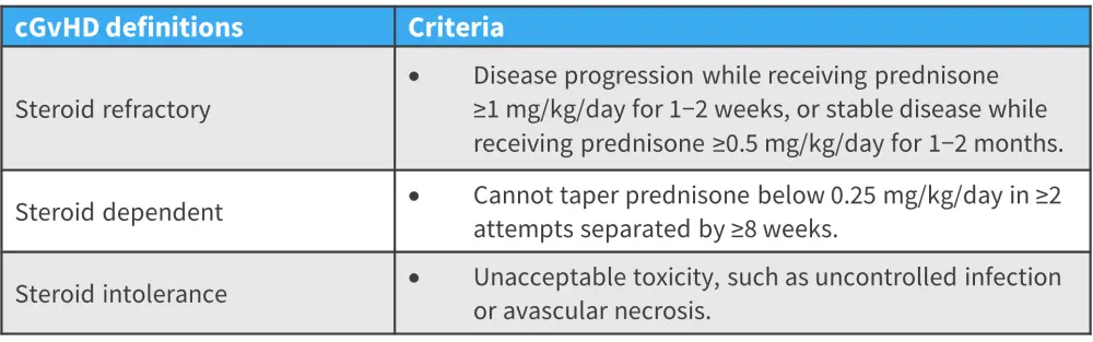 The current definitions are shown in Figure 2, these were developed by the EMBT-NIH-CIBMTR task force. However, the current definition of SR-GvHD requires progression and clinicians may want to change treatment before progression e.g., when a patient experiences a poor or no response after a certain therapy duration. Therefore, this definition may not be suitable for clinical practice.2