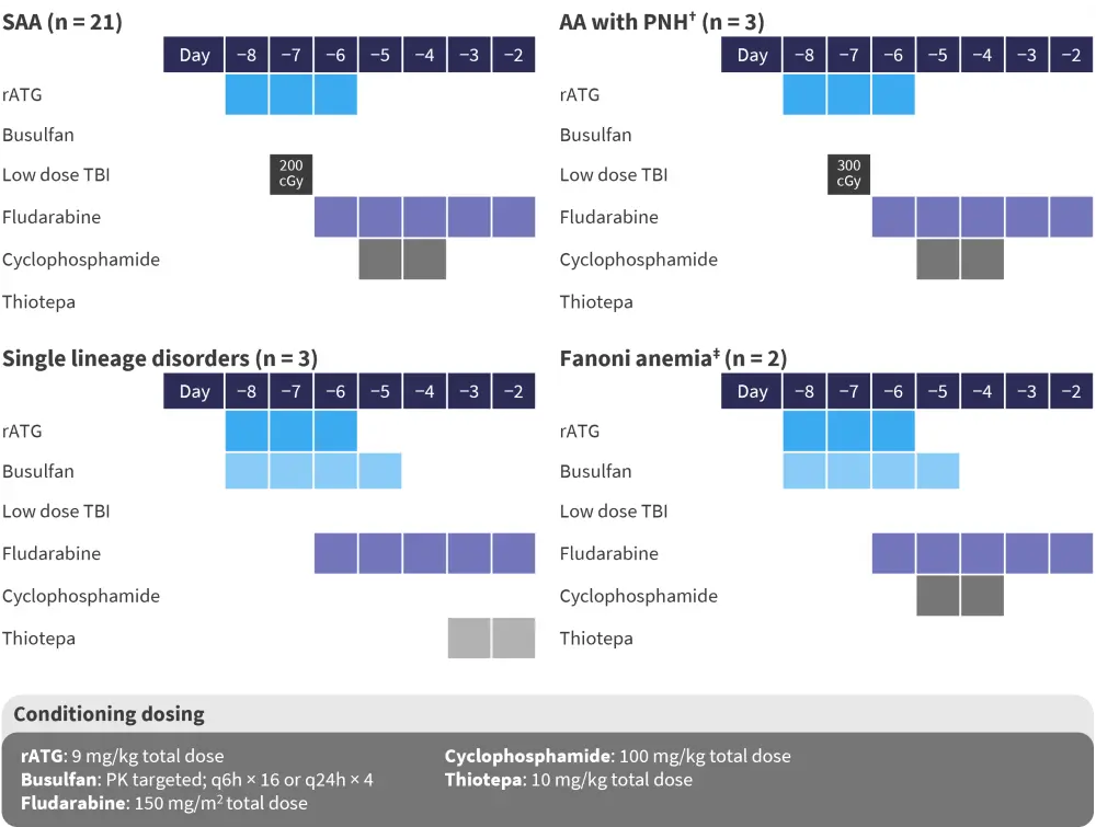 HLA, human leukocyte antigen; HLH, hemophagocytic lymphohistiocytosis; IBMFS, inherited bone marrow failure syndromes; PID, primary immunodeficiency; RBC, red blood cell; SAA, severe aplastic anemia; SCID, severe combined immunodeficiency; TBI, total body irradiation; thal, thalassemia. |