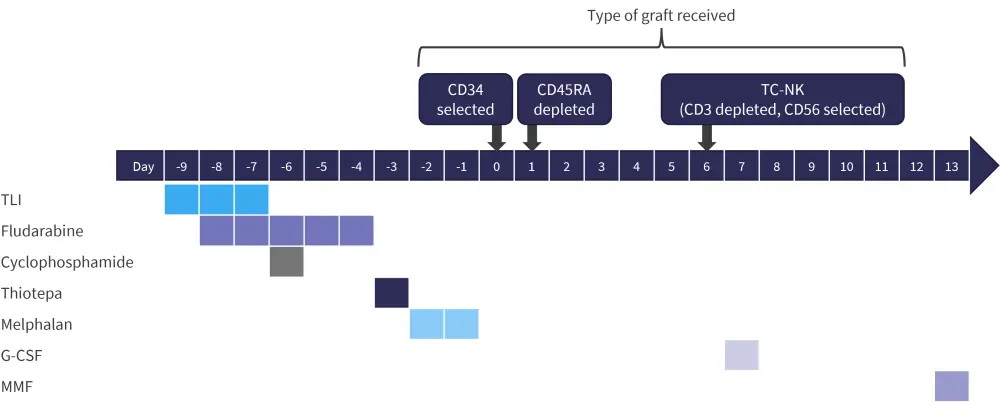 G-CSF, granulocyte-colony stimulating factor; MMF, mycophenolate mofetil; TC-NK, T cell-natural killer; TLI, T- lymphocyte irradiation.