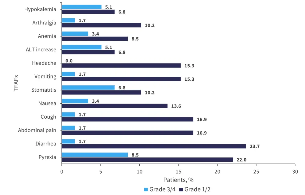 Pyrexia, diarrhea, and abdominal pain were the most frequently reported Grade 1−2 AEs in all patients. The most common Grade ≥3 AEs were pyrexia, stomatitis, increased alanine aminotransferase, and hypokalemia (Figure 3).