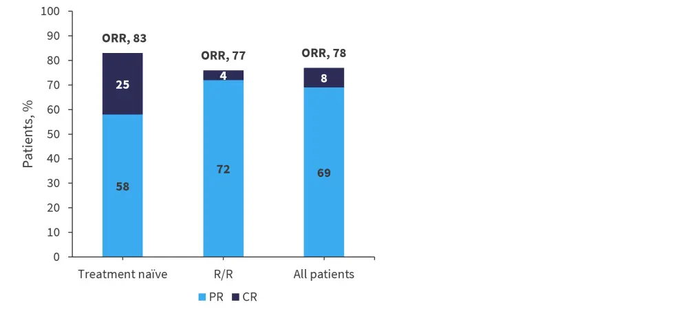 The overall response rate was 78%, with a median time to first response of 4 weeks (range, 3.7–84.1 weeks) and a median time to best response of 6 weeks (3.7−84.1 weeks). In the treatment-naïve group, 25% of patients achieved a complete response, compared with only 4% in the R/R group (Figure 4).
