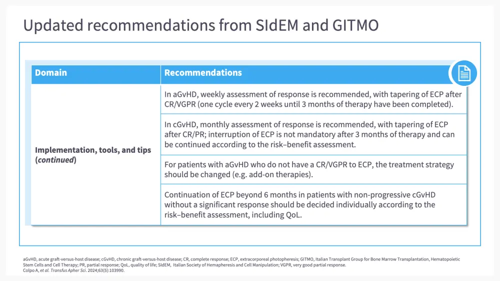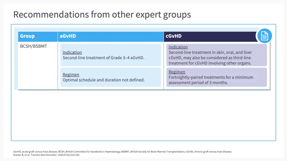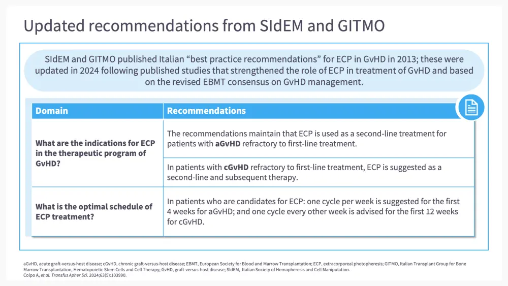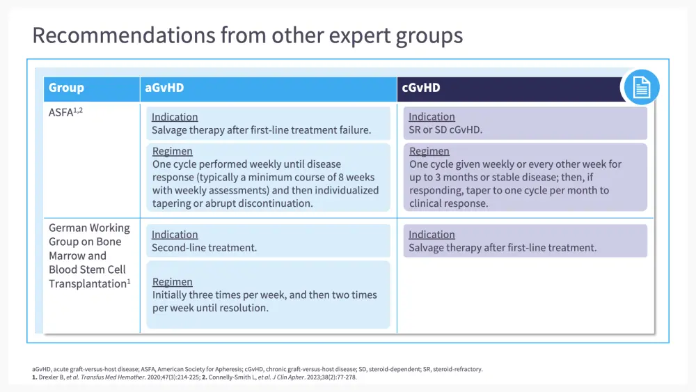In the third chapter of this e-learning module, we provide an overview of the current guidelines and latest recommendations from expert groups, including the American Society for Apheresis (ASFA), alongside multiple European groups from Italy, Germany, and the UK, for the use of ECP for the treatment of acute and chronic GvHD.