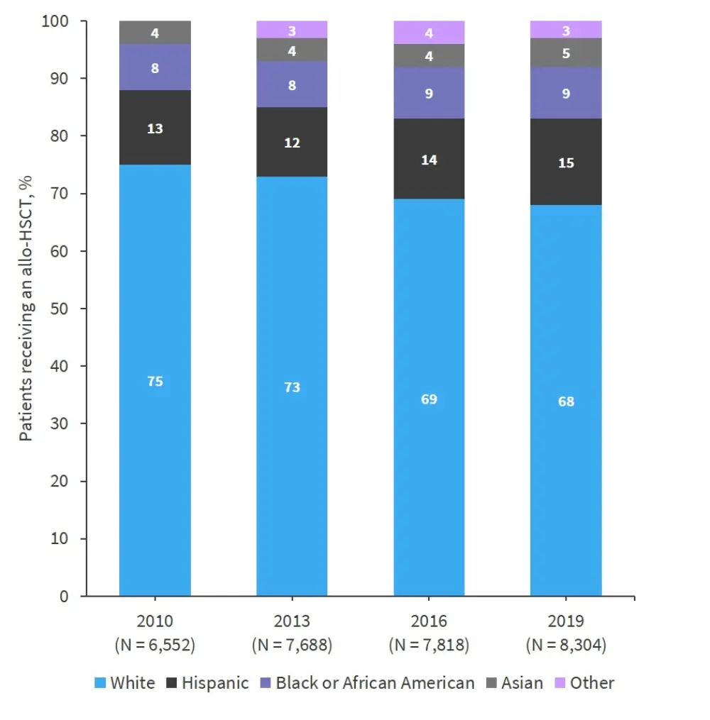 Since 2010, the number of patients receiving an allogeneic hematopoietic stem cell transplant (HSCT) has increased, but the proportion of patients from different ethnic groups has remained similar (Figure 4).