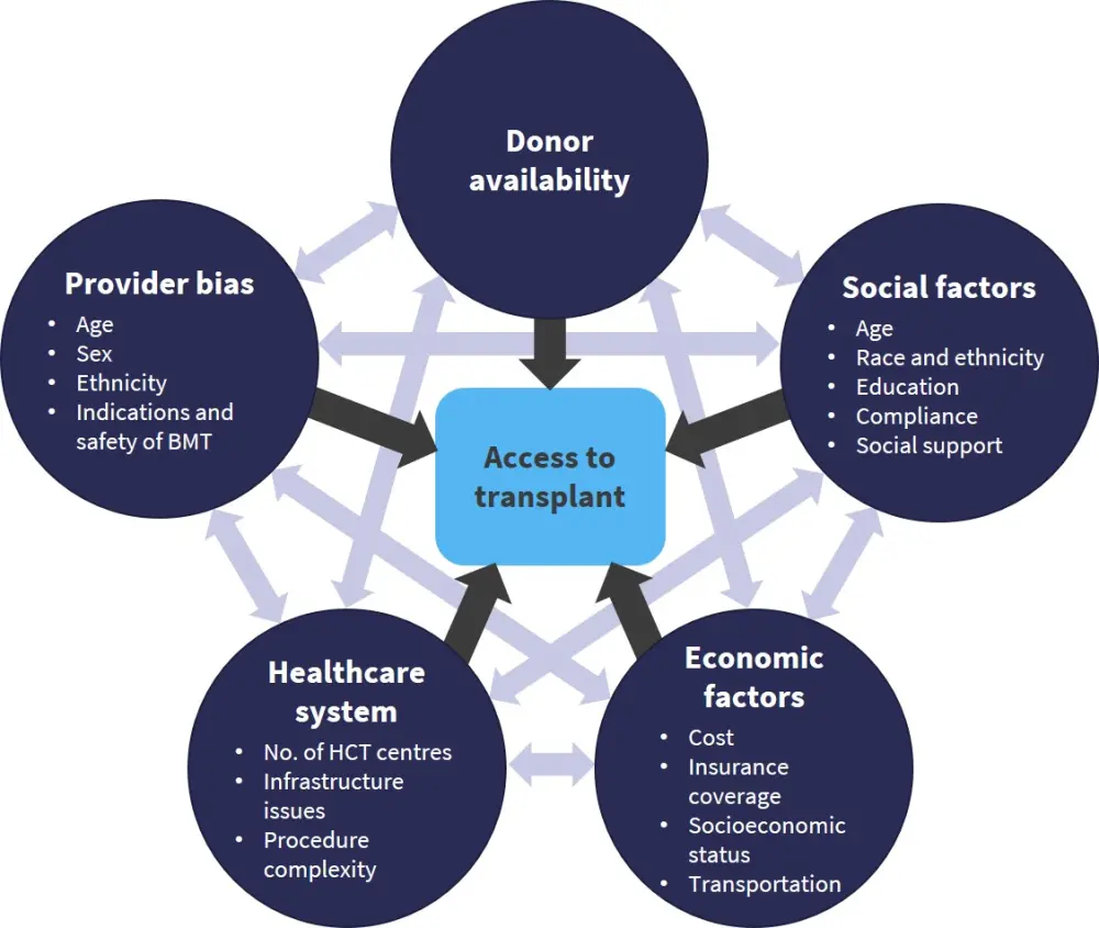 Examining different treatment and diagnostic options for patients undergoing bone marrow transplant (BMT) is an important part of improving outcomes. However, the wider context in which these transplants is occurring is also a crucial part of the equation and can exert great influence on the outcome of therapy. The race and ethnicity of patients can impact how likely a patient is to receive a BMT. The reasons for this are multifactorial and complex, covering a range of issues, including poverty, provider bias, healthcare infrastructure, and social factors (Figure 1).1