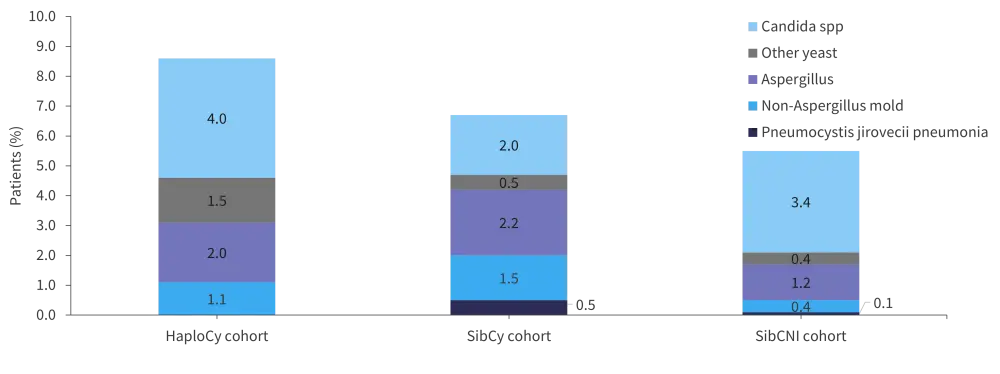 At least one fungal infection 180 days post-HSCT occurred in 7%, 6%, and 4% of patients in the HaploCy, SibCy, and SibCNI cohort, respectively (p < 0.001). Figure 1 shows the proportion of patients for each type of fungal infection across all three cohorts. Fungal infection density scores for yeast and mold are shown in Table 2.