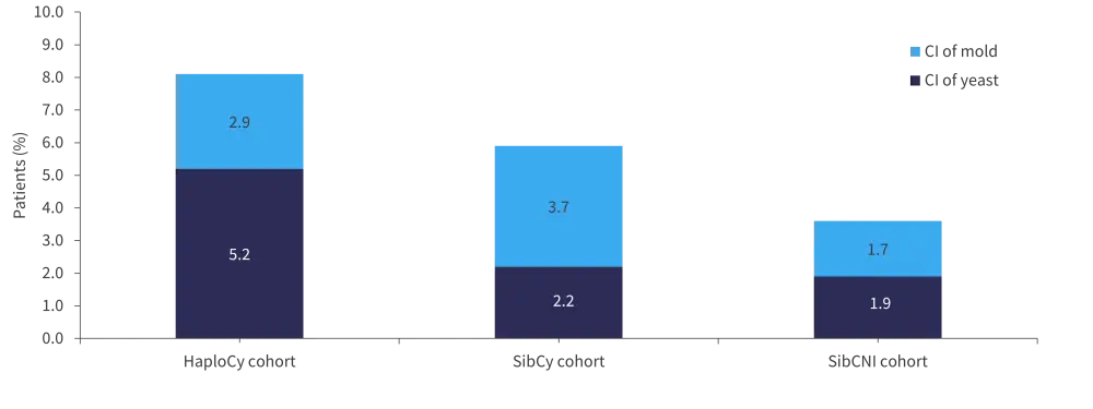 The cumulative incidence of yeast infection was higher in HaploCy cohort compared with SibCy and SibCNI cohort (p < 0.001;Figure 2). The incidence of mold fungal infection was higher in the PTCy cohort vs SibCNI cohort (p = 0.040). This statistical significance was lost when assessing the incidence based on time to neutrophil engraftment and onset of acute GvHD (aGvHD).