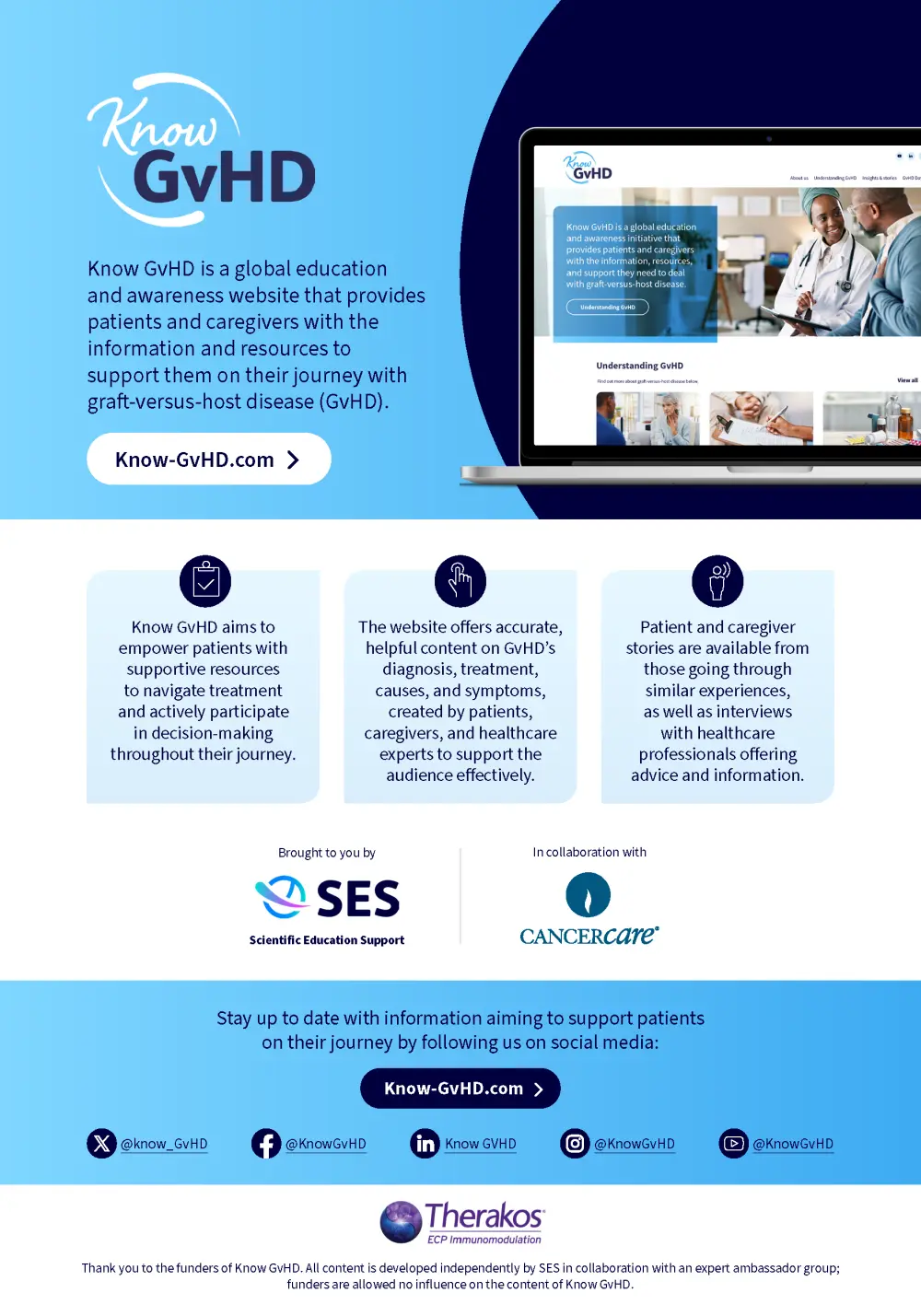 The Know GvHD website offers accurate, helpful content on the diagnosis, treatment, causes, and symptoms of GvHD, created by patients, caregivers, and healthcare experts to effectively support the audience.
