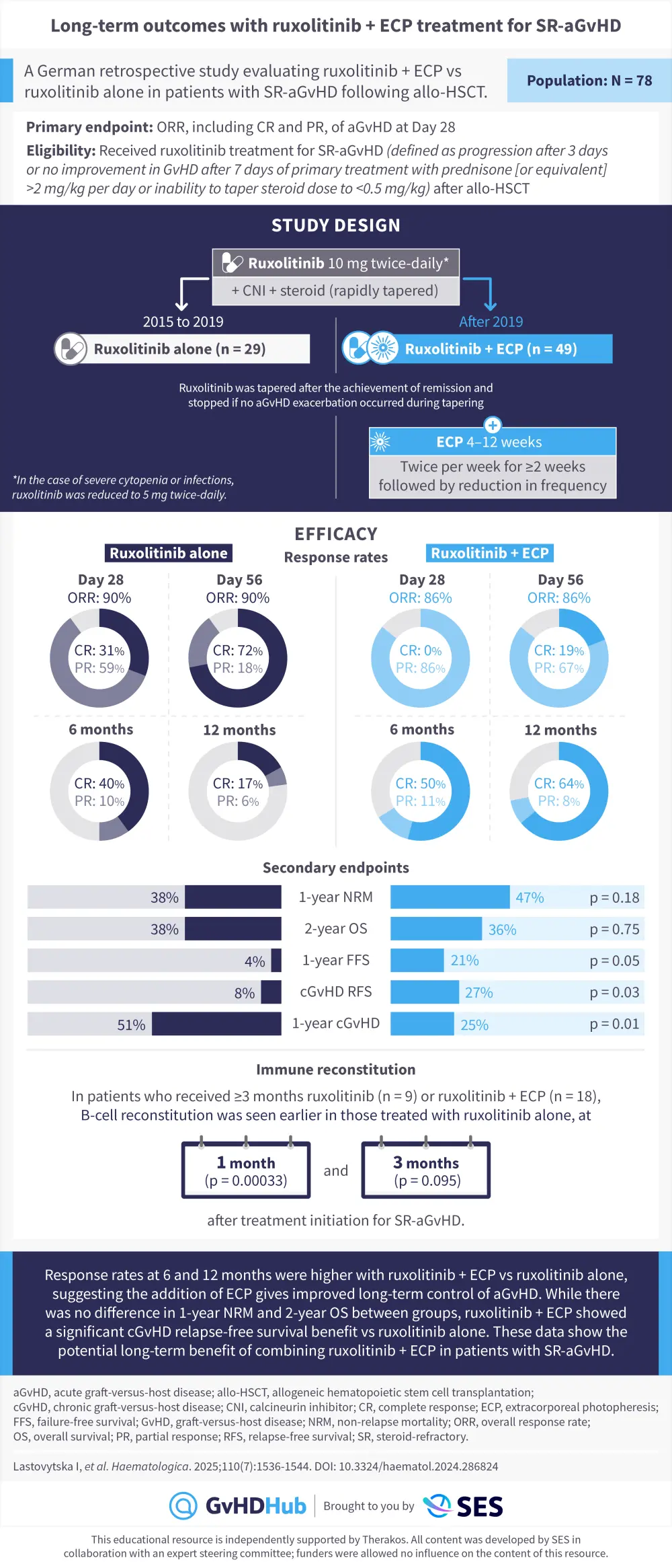Patients (N = 78) received oral ruxolitinib and steroid therapy followed by either ruxolitinib alone or ruxolitinib + ECP.1 Response rates at 6 and 12 months were higher with ruxolitinib + ECP than with ruxolitinib alone, suggesting improved long-term control of aGvHD. Furthermore, while there was no difference in 1-year non-relapse mortality and 2-year overall survival between treatment groups, a significant cGvHD relapse-free survival benefit was observed with ruxolitinib + ECP vs ruxolitinib alone.