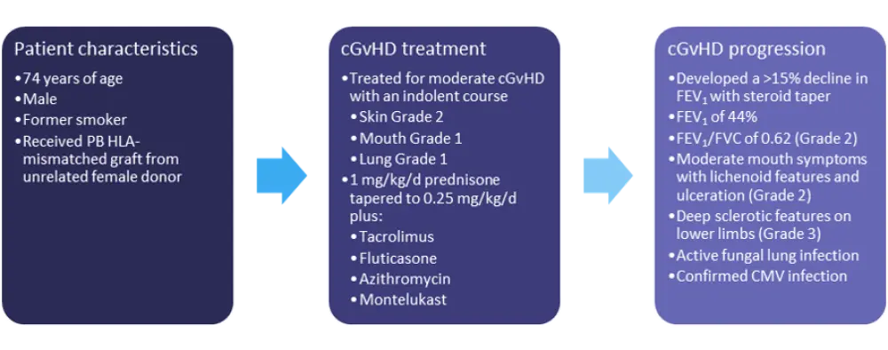 *Adapted from Wolff, et al.1The best option for most patients with SR-cGvHD is enrollment in a clinical trial, though this patient would likely be ineligible due to his active fungal infection. The use of ruxolitinib, ibrutinib, or mycophenolate mofetil (MMF) should also be avoided due to the potential of these agents to further exacerbate the patient’s active lung infections. Extracorporeal photopheresis (ECP) would be the best treatment option for this patient due to the severity of his airway obstruction and extrapulmonary involvement, as ECP has demonstrated efficacy and safety in patients with pulmonary, sclerodermatous, and mucosal GvHD.