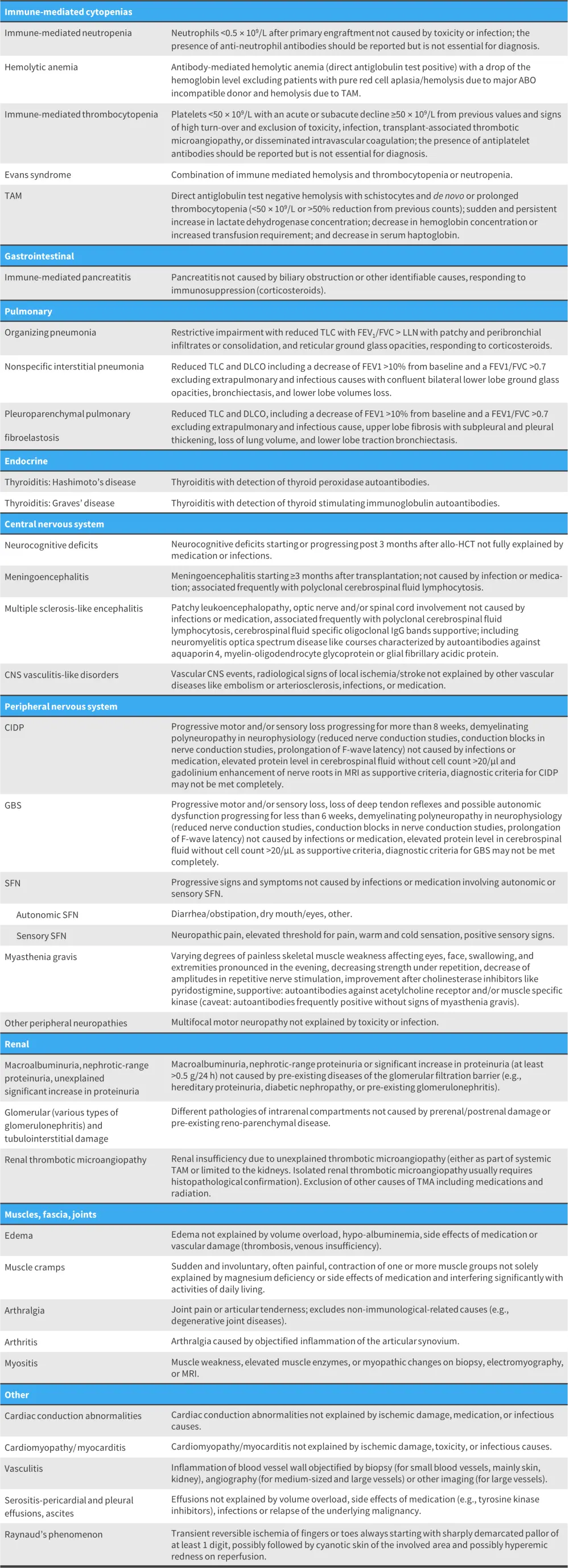 Allo-HCT, allogeneic hematopoietic stem cell transplant; CIDP, chronic inflammatory demyelinating polyneuropathy; CNS, central nervous system; DLCO, diffusing capacity for carbon monoxide; FEV-1, forced expiratory volume in 1 second; FVC, forced vital capacity; GBS, Guillain Barré syndrome; MRI, magnetic resonance imaging; SFN, small fiber polyneuropathy; TAM, transplant-associated microangiopathy; TLC, total lung capacity; TMA, thrombotic microangiopathy.