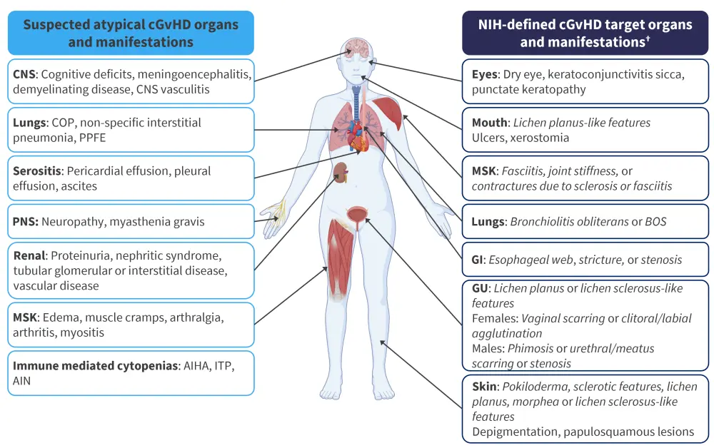 AIHA, autoimmune hemolytic anemia; AIN, autoimmune neutropenia; BOS, bronchiolitis obliterans syndrome; cGvHD, chronic graft-versus-host disease; CNS, central nervous system; COP, cryptogenic organizing pneumonia; GI, gastrointestinal; GU, genitourinary; ITP, immune thrombocytopenia purpura; MSK, musculoskeletal system; NIH, National Institutes of Health; PNS, peripheral nervous system; PPFE, pleuroparenchymal pulmonary fibroelastosis.
