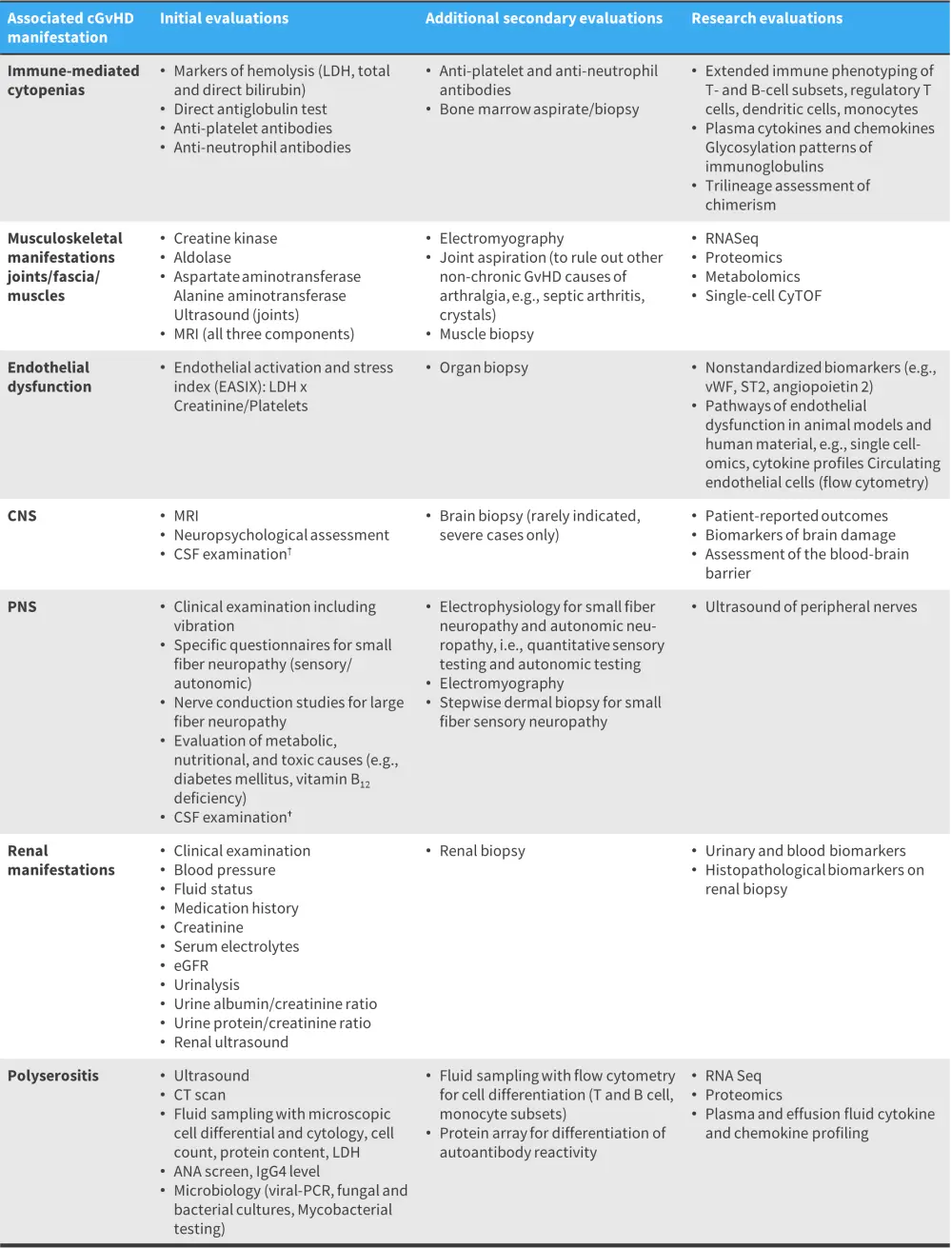 ANA, anti-nuclear antibody; cGvHD, chronic graft-versus-host disease; CNS, central nervous system; CSF, cerebrospinal fluid; CT, computed tomography; CyTOF, cytometry by time of flight; eGFR, estimated glomerular filtration rate; LDH, lactate dehydrogenase; PCR, polymerase chain reaction; PNS, peripheral nervous system; RNA Seq, RNA sequencing; vWF, von Willebrand factor.