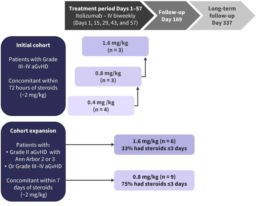 EQUATE is an ongoing phase Ib/II, open-label, dose-escalation, multi-center trial, evaluating the efficacy and safety profile of itolizumab in patients aged ≥18 years with Grade III–IV aGvHD, who have received their first allo-HSCT. Patients received itolizumab intravenously biweekly at doses 0.4 mg/kg, 0.8 mg/kg, and 1.6 mg/kg, and were followed up through Day 337 (Figure 2).