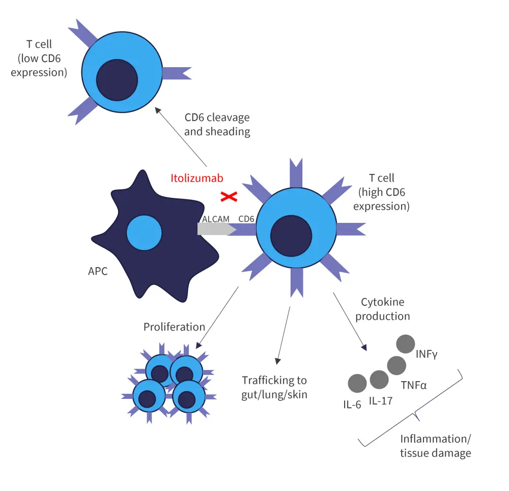 CD6 is a co-stimulatory receptor, predominantly expressed on T cells. CD6 binds to ALCAMs present on antigen presenting cells, and epithelial and endothelial cells present on various tissues, including skin, gut, and lung. The CD6-ALCAM pathway modulates T-cell activation, proliferation, and trafficking, and thus plays an integral part in inflammation and autoimmunity. Itolizumab binds to CD6 (at Domain-1) and causes shedding of the receptor. T cells with lower levels of CD6 exhibit reduced sensitivity to stimulation, including decreased activation, proliferation, and cytokine production (Figure 1).