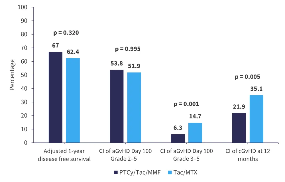 There were no differences in chimerism or rejection in the trial, with a graft rejection rate of 3% in the PTCy/Tac/MMF arm and 0.5% in the Tac/MTX arm. The most common cause of death was recurrent or persistent disease, affecting 39.6% of patients in the PTCy/Tac/MMF arm and 42.9% of patients in the Tac/MTX arm. Acute GvHD was a more common cause of death in the Tac/MTX arm (14.3%) compared with the PTCy/Tac/MMF arm (4.2%), whereas organ failure was a common cause of death in the PTCy/Tac/MMF arm (22.9%) compared with the Tac/MTX arm (10.7%).