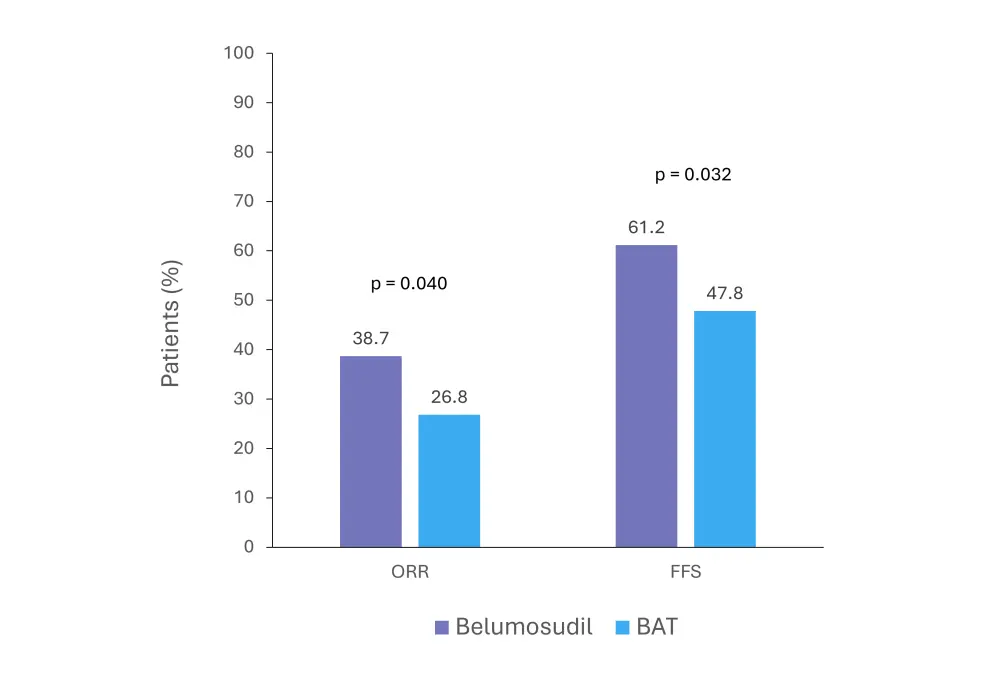 More patients treated with belumosudil achieved the primary endpoint of overall response at 6 months (Figure 2) compared with those who received BAT (38.7% vs 26.8%; p = 0.040).