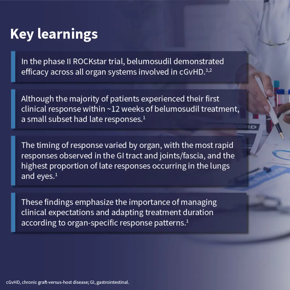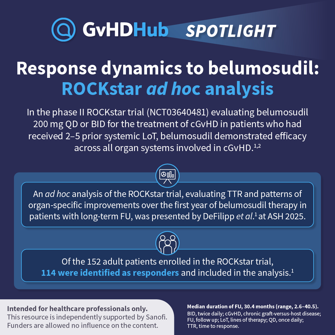 Chronic graft-versus-host disease (cGvHD) is a heterogenous, multiorgan complication of allogeneic hematopoietic stem cell transplantation (allo-HSCT),1 affecting up to 70% of transplant recipients.2 In the phase II ROCKstar trial (NCT03640481), belumosudil, a selective ROCK2 inhibitor, demonstrated efficacy across all organ systems involved in cGvHD.2 However, the timing and dynamics of organ-specific responses remain poorly characterized. An ad hoc analysis of the ROCKstar trial, evaluating time to response (TTR) and patterns of organ-specific improvement over the first year of belumosudil therapy, was presented by Zachariah DeFilipp at the 67th American Society of Hematology (ASH) Annual Meeting and Exposition, Dec 6–9, 2025, Orlando, US.3