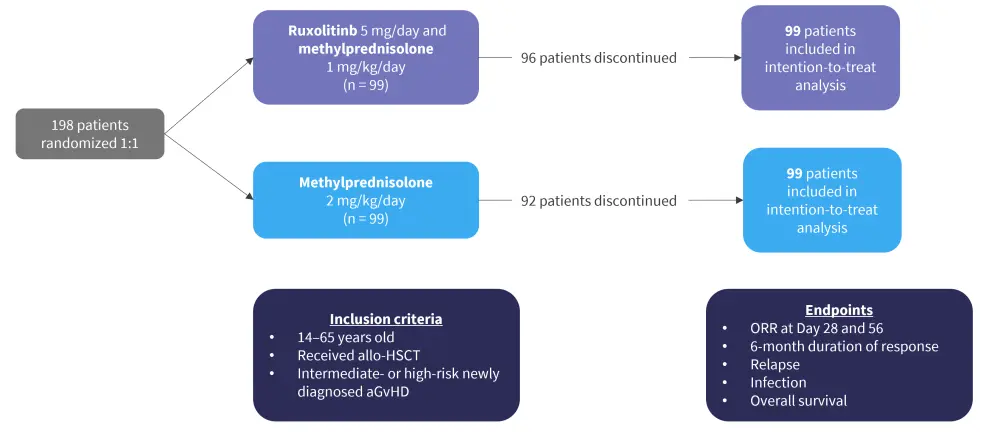 Patients with intermediate- or high-risk aGvHD, as determined by biomarker analysis (REG3a and ST2 were measured at Day 0 and following 4 weeks of treatment), were enrolled in the study (n = 198; Figure 1). Patients in the ruxolitinib group received a reduced dose of steroids every 5 days to achieve a dose of 0.1 mg/kg by Day 30, before being tapered off after 6 weeks. Ruxolitinib was given every day for 90 days and then tapered off.