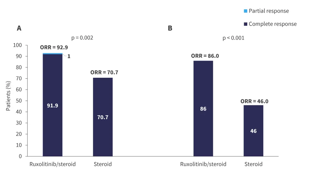 These data demonstrate that combination low-dose ruxolitinib + steroids can produce high response rates in patients with intermediate- and high-risk aGvHD, with similar safety signals steroid monotherapy. Failure-free survival was significantly higher in the ruxolitinib group compared with the steroids only group; furthermore, reduced cumulative use of steroids was shown to reduce the incidence of side effects and improve patient quality of life. Based on these findings, ruxolitinib with low-dose steroids represents a potential effective treatment option for patients with aGvHD.