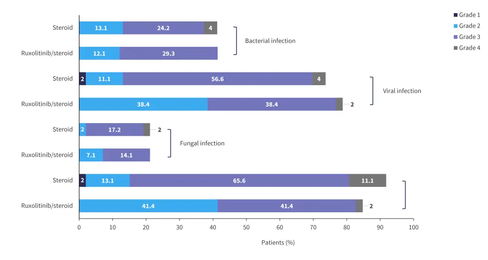 The rate of Grade 3 and 4 severe adverse events was similar between the groups, with 87.9% and 85% of patients experiencing a severe event in the ruxolitinib and steroid only group, respectively; however, Grade 4 events were more common in the steroid only group (50.5% vs 26.3%). Grade 3 and 4 thrombocytopenia occurred in 56.5% and 69.7% of patients treated with ruxolitinib and steroids alone, respectively. Rates of Grade 3 and 4 infections were higher in patients treated with steroids only, there was also no significant difference in the rates of cytomegalovirus and Epstein-Barr virus between treatment groups; the infection rates of both treatment groups are shown in Figure 4.