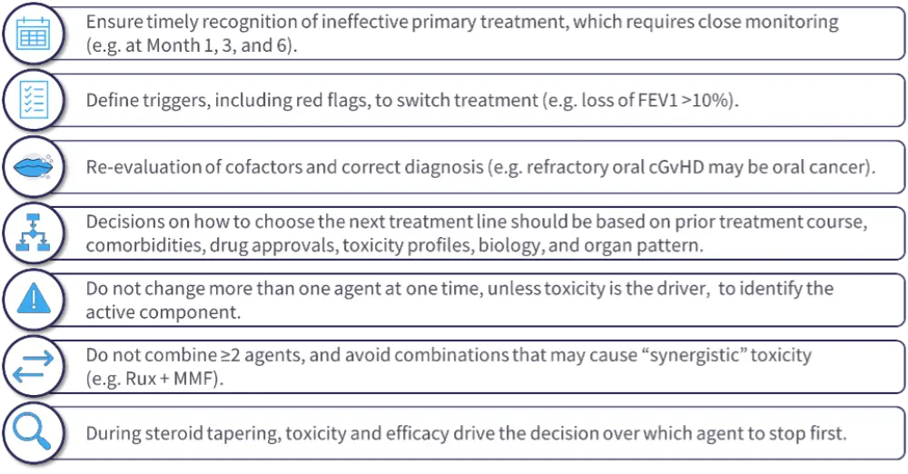 Wolff provided an overview of the treatment options for second-line treatment of GvHD and subsequent advanced-line options, emphasizing that early detection of disease progression and sufficient treatment intervention are crucial, as advanced disease is often nonreversible. Wolff discussed response assessments to first-line steroid treatment and second-line treatments, and outlined the treatment options for patients with SR-cGvHD, including ruxolitinib, belumosudil, axatilimab, ibrutinib and extracorporeal photopheresis (ECP).