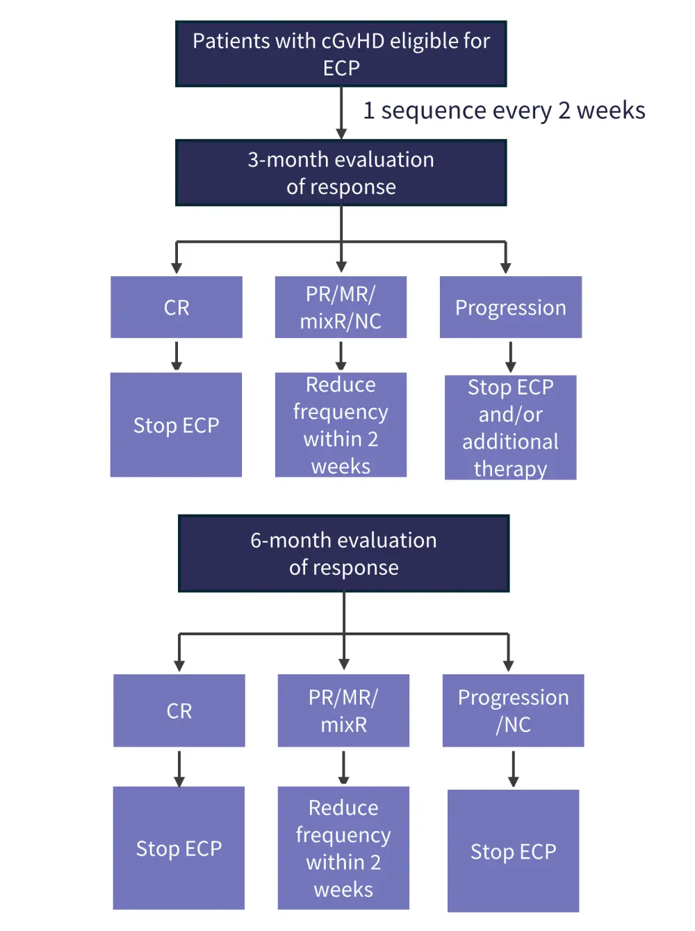 cGvHD, chronic graft-versus-host disease; CR, complete response; ECP, extracorporeal photopheresis; MR, minimal response; mixR, mixed response; NC, no change; PR, partial response; SR, steroid-refractory.