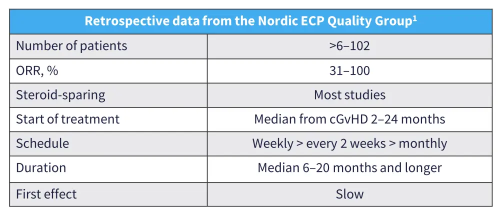 Zinaida Perić, University of Rijeka, Rijeka, HR, shared her thoughts on patient eligibility, treatment optimization, and follow-up after treatment with ECP for cGvHD. She also discussed a case report of a patient with steroid-refractory (SR)-cGvHD, plus retrospective (Table 1) and prospective data on the use of ECP in cGvHD. In addition, she shared the Nordic ECP Quality Group treatment guidelines for SR-cGvHD.