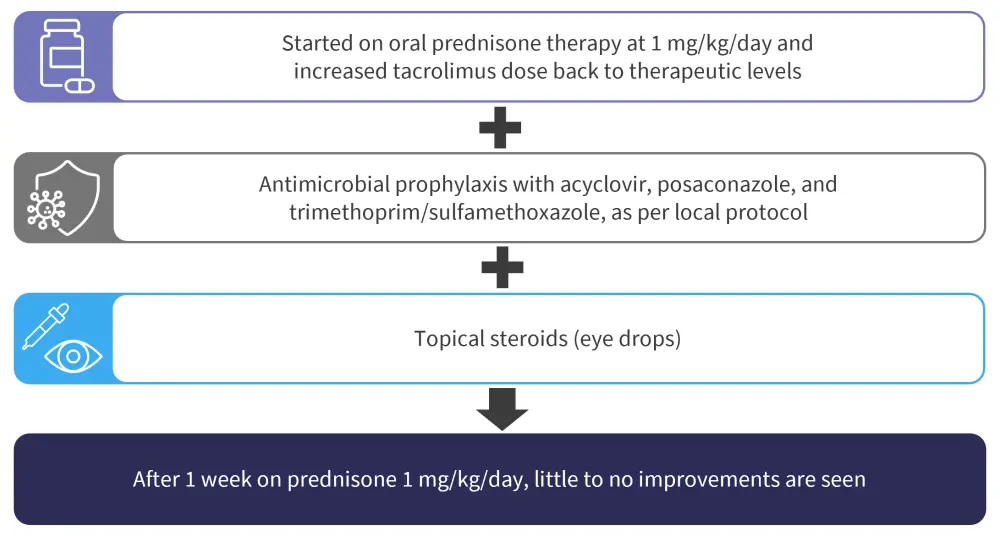 The patient is young and has developed moderate chronic GvHD with skin mucosal and ophthalmic involvement early post-allo-HSCT (5 months) during tapering of post-transplant immunosuppression. The patient has now failed to respond to 1 mg/kg steroid treatment alongside increased tacrolimus dosing (back to therapeutic levels).