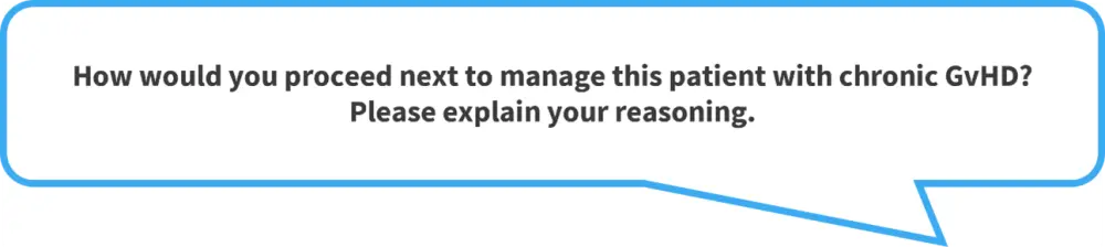First-line therapy for patients with graft-versus-host disease (GvHD) is treatment with steroids; however, ~50% of patients do not respond to initial treatment.1 To explore how to approach these patients, we spoke to Arnon Nagler, who has provided his opinion on how to treat a particular patient with chronic GvHD who was not responding to prednisone.