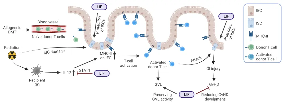 Leukemia inhibitory factor (LIF) has been shown to be involved in regulating inflammation and maintenance of intestinal stem cell function and number.1 The mechanism by which LIF can provide a protective benefit against GvHD is shown in Figure 1. Here, we discuss a preclinical study by Wang et al.1 that investigated the role of LIF in GvHD using murine models.