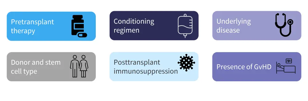 Before vaccinating a patient who has undergone HSCT, the immune status of the patient and risk of severe disease versus the possible benefit of an adequate response should be considered. Factors that can affect immune status are shown in Figure 1.