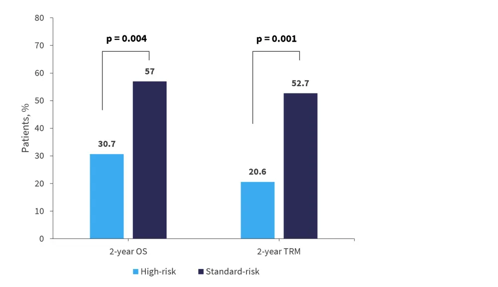 Rates of 2-year overall survival and transplant-related mortality (TRM) stratified by Minnesota risk score revealed improved survival and lower TRM in patients with a standard risk score compared with those classified as high-risk (Figure 1).